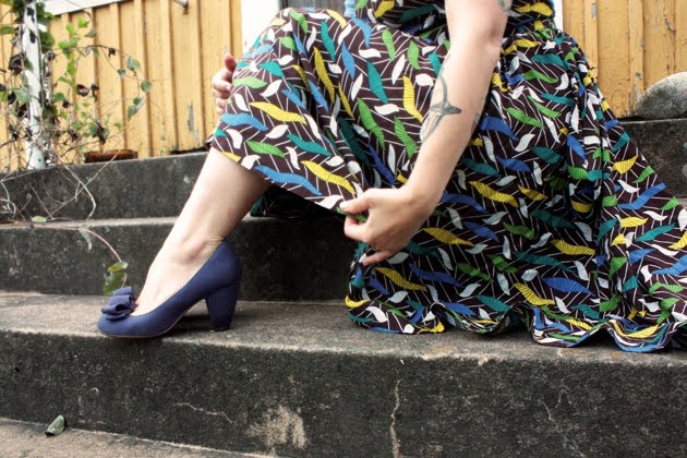The dress is the Trixie sarong dress from Trashy Diva (summer decided to linger a little longer, yey; I got a chance to wear it this year still!). The shoes are from Andiamo last spring and the jewelry vintage. And yes, I have rollers in my hair; this is usually how I leave home for a show; huge-headed.